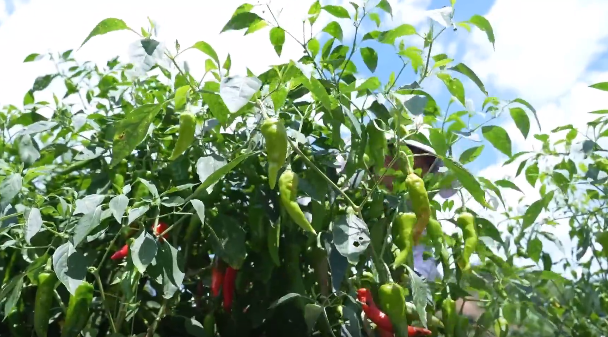 当地村民告诉笔者,独特的高山气候和土壤条件,孕育出的辣椒肉质脆嫩、辣中回甜,深受市场青睐。通过多茬采摘,辣椒的收获期可持续到中秋节左右。“这个辣椒的口感,带一点辣味,条形比较好,皮也比较薄,肉也比较脆。”蒋胜取笑着说道,“吃起来有一点微甜,可以做辣椒酱、腌辣椒、干辣椒。”