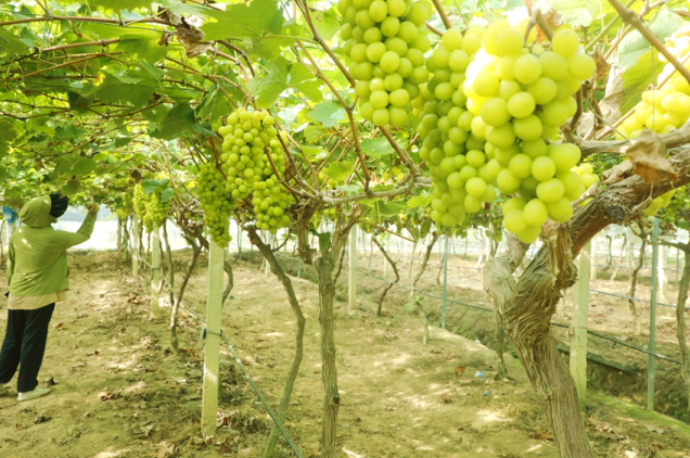 农场主张忠社也穿梭在果园中,“今年雨水少、日照足,葡萄品相和口感都比去年好!开采才一个月,十余亩葡萄就快卖光了。”说着,他举起一串沉甸甸的巨峰葡萄展示道:“瞧,这单颗能有7到9克,甜度更高,咬下去特别甜,吸引了许多回头客。”